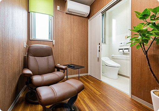 プライバシーを確保した完全個室で、ストレスレスチェア、テレビ、広々としたトイレを完備。大腸内視鏡検査を行うには、大腸の状態をきれいにするために下剤を飲む必要がありますが、より落ち着いた雰囲気のリラックス出来る空間でお過ごしいただけるように配慮しています。