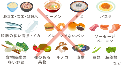※便秘の方や、前回の検査で野菜や種が残っていた方は、検査の3日前から食べてはいけないものをお控えください。