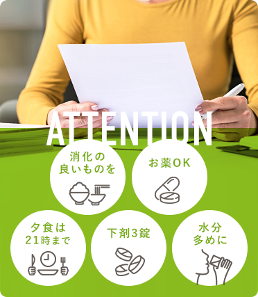 前日、水分は水またはお茶を多めにとってください。