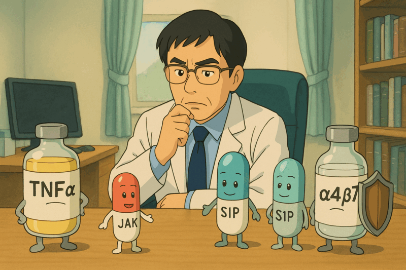たとえば潰瘍性大腸炎の難治例では、複数の薬の中から「どの薬を、どの状態のときに、どの順番で使うか」という明確な基準(ガイドライン)が現時点では定められていません。胃がんや大腸がんのように「進行度に応じて内視鏡→手術→化学療法」と治療方針が整理されている病気とは違い、炎症性腸疾患ではその基準がまだ発展途上なのです。