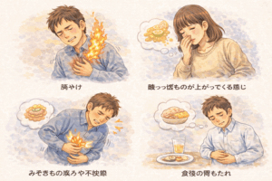 ☑ 胸やけ ☑ 酸っぱいものが上がってくる感じ ☑ みぞおちの痛みや不快感 ☑ 食後の胃もたれ といった症状が現れることがあります。
