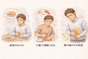☑ 食後のもたれ ☑ 少量で満腹になる ☑ 胃の張りや不快感 などが慢性的に続く状態です。ストレスや自律神経の影響を受けやすいのも特徴です。
